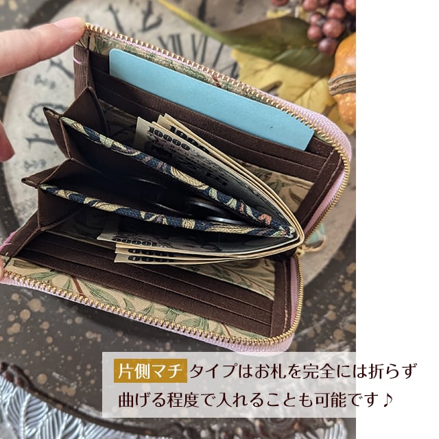 また片側にマチをつけた事により、一般的なL字ファスナーのお財布より小銭の出し入れがスムーズ。